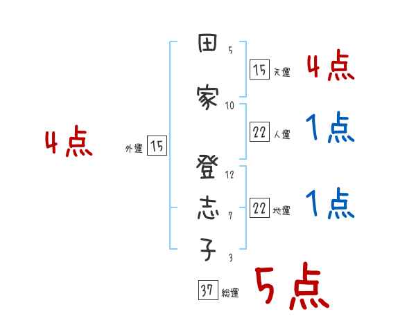 人運![]() | 田家登志子さんの人運は22画の1つ星!努力することが苦手ないっぽう手先が器用。芸術性にも優れる。 性格や才能などを表す2番目に重要な運勢です。人間関係や協調性、社会的な成功に影響します。主に20歳から50歳ぐらいまでの中年期の運勢を表します。 |