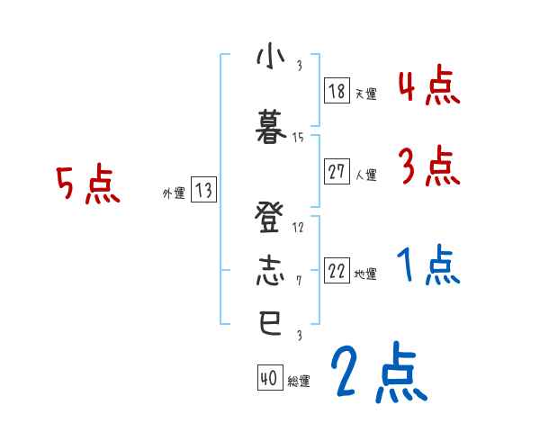天運![]() | 小暮登志巳さんの天運は18画の4つ星!情熱的で剛気。忍耐力があり信頼される。 家系が持つ宿命的な運勢を表します。祖先から受け継いだ苗字ですので自分の力が及びません。家柄を象徴します。 |