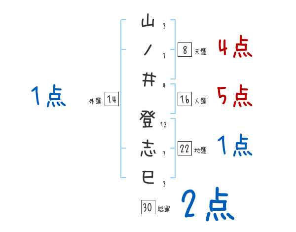 人運![]() | 山ノ井登志巳さんの人運は16画の5つ星!人望が厚く大きく発展する。逆転成功が見える。 性格や才能などを表す2番目に重要な運勢です。人間関係や協調性、社会的な成功に影響します。主に20歳から50歳ぐらいまでの中年期の運勢を表します。 |