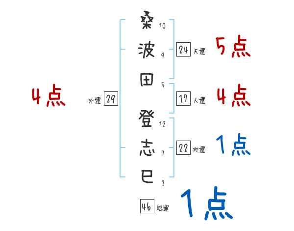 天運![]() | 桑波田登志巳さんの天運は24画の5つ星!家庭運が良く順調な人生。金運にも恵まれる。 家系が持つ宿命的な運勢を表します。祖先から受け継いだ苗字ですので自分の力が及びません。家柄を象徴します。 |