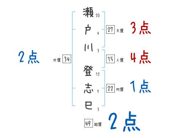 天運![]() | 瀬戸川登志巳さんの天運は27画の3つ星!頭脳明晰だが強情で摩擦が多い傾向。孤立に注意。 家系が持つ宿命的な運勢を表します。祖先から受け継いだ苗字ですので自分の力が及びません。家柄を象徴します。 |