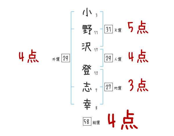 外運![]() | 小野沢登志幸さんの外運は29画の4つ星!完全主義で才能がある。厳格な心の持ち主。 生活面を象徴する運勢です。外部から受ける影響力を表し、結婚運、家庭運や職場、環境への順応性を表します。 |