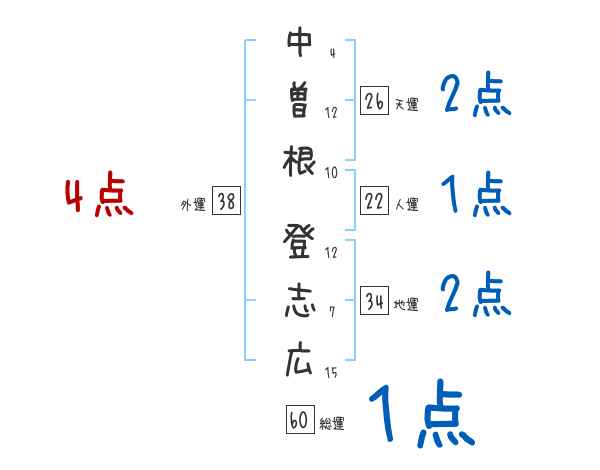 総運![]() | 中曽根登志広さんの総運は60画の1つ星!悲観的で迷いやすい。波乱が多く損をしないように。 あなたの人生を表す1番重要な運勢です。生涯を通じて影響する総合運となり、主に50歳以降の晩年期に影響を及ぼします。 |