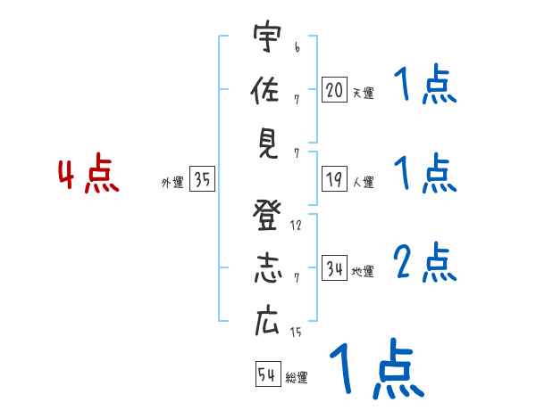 外運![]() | 宇佐見登志広さんの外運は35画の4つ星!温厚な性格で感受性が高い。穏和な性格で人望が厚い。 生活面を象徴する運勢です。外部から受ける影響力を表し、結婚運、家庭運や職場、環境への順応性を表します。 |