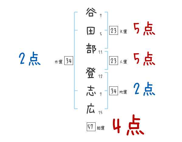 人運![]() | 谷田部登志広さんの人運は23画の5つ星!想像力に優れ活力がある。一代で成功し名誉を手に入れる。 性格や才能などを表す2番目に重要な運勢です。人間関係や協調性、社会的な成功に影響します。主に20歳から50歳ぐらいまでの中年期の運勢を表します。 |