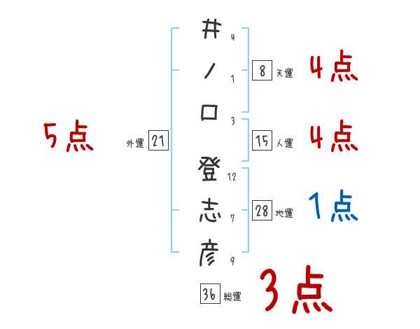総運![]() | 井ノ口登志彦さんの総運は36画の3つ星!先見性が豊かです。多少神経質で苦労することも。 あなたの人生を表す1番重要な運勢です。生涯を通じて影響する総合運となり、主に50歳以降の晩年期に影響を及ぼします。 |