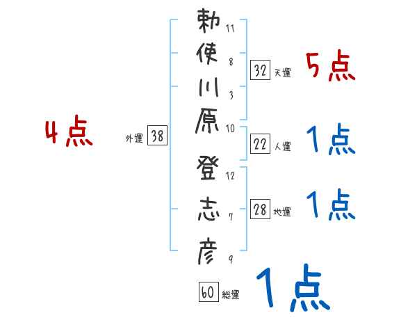 天運![]() | 勅使川原登志彦さんの天運は32画の5つ星!柔軟性があり成功する。チャンスが多く金運が良い。 家系が持つ宿命的な運勢を表します。祖先から受け継いだ苗字ですので自分の力が及びません。家柄を象徴します。 |