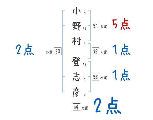 天運![]() | 小野村登志彦さんの天運は21画の5つ星!統率力がある。独立し成功する。名誉を手に入れる。 家系が持つ宿命的な運勢を表します。祖先から受け継いだ苗字ですので自分の力が及びません。家柄を象徴します。 |