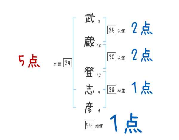 地運![]() | 武蔵登志彦さんの地運は28画の1つ星!家庭環境に注意。スポーツで活躍できる能力があるかも。 個性を表す基礎的な運勢です。性格形成や対人関係、行動力など家庭環境に影響されます。主に誕生してから20歳くらいまでの若年期の運勢を表します。 |