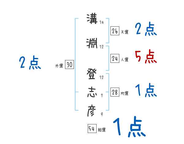 天運![]() | 溝淵登志彦さんの天運は26画の2つ星!波瀾万丈かも。信頼できる人を大事にしましょう。 家系が持つ宿命的な運勢を表します。祖先から受け継いだ苗字ですので自分の力が及びません。家柄を象徴します。 |