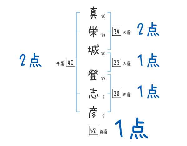 人運![]() | 真栄城登志彦さんの人運は22画の1つ星!努力することが苦手ないっぽう手先が器用。芸術性にも優れる。 性格や才能などを表す2番目に重要な運勢です。人間関係や協調性、社会的な成功に影響します。主に20歳から50歳ぐらいまでの中年期の運勢を表します。 |