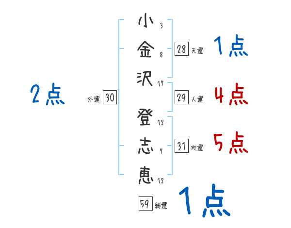 天運![]() | 小金沢登志恵さんの天運は28画の1つ星!家庭環境に注意。スポーツで活躍できる能力があるかも。 家系が持つ宿命的な運勢を表します。祖先から受け継いだ苗字ですので自分の力が及びません。家柄を象徴します。 |