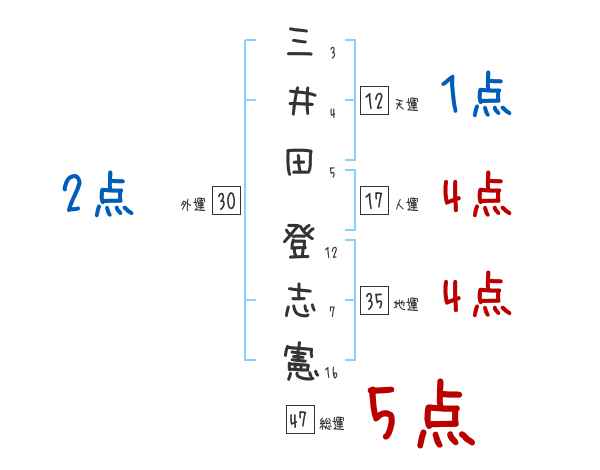 天運![]() | 三井田登志憲さんの天運は12画の1つ星!簡単な失敗で諦めてしまいやすいかも。着実に行動すると良いでしょう。 家系が持つ宿命的な運勢を表します。祖先から受け継いだ苗字ですので自分の力が及びません。家柄を象徴します。 |