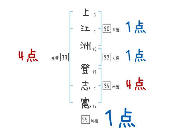 外運![]() | 上江洲登志憲さんの外運は33画の4つ星!権力志向でプライドが高い。勇気があり運を切り開き成功する。 生活面を象徴する運勢です。外部から受ける影響力を表し、結婚運、家庭運や職場、環境への順応性を表します。 |