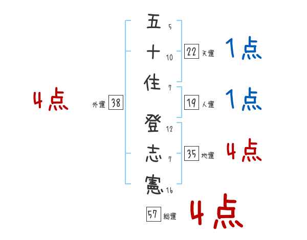 総運![]() | 五十住登志憲さんの総運は57画の4つ星!向上心があり人望がある。地位を得る。 あなたの人生を表す1番重要な運勢です。生涯を通じて影響する総合運となり、主に50歳以降の晩年期に影響を及ぼします。 |