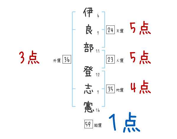 総運![]() | 伊良部登志憲さんの総運は59画の1つ星!意志の弱さであきらめることが多いかも。粘り強さが必要。 あなたの人生を表す1番重要な運勢です。生涯を通じて影響する総合運となり、主に50歳以降の晩年期に影響を及ぼします。 |