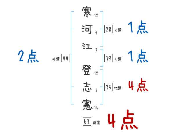 外運![]() | 寒河江登志憲さんの外運は44画の2つ星!誠実で慎重な性格。物事を考えすぎないように注意しましょう。 生活面を象徴する運勢です。外部から受ける影響力を表し、結婚運、家庭運や職場、環境への順応性を表します。 |