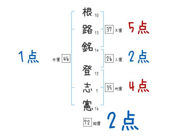 総運![]() | 根路銘登志憲さんの総運は72画の2つ星!災難が多く不安定な生活にならないように注意。明暗のある人生かも。 あなたの人生を表す1番重要な運勢です。生涯を通じて影響する総合運となり、主に50歳以降の晩年期に影響を及ぼします。 |