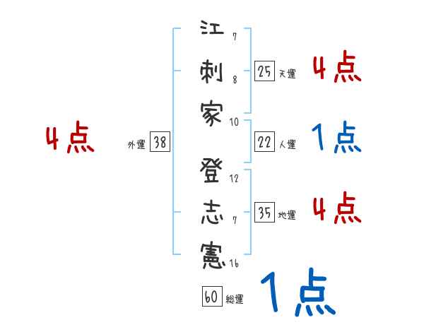 江刺家登志憲さんの画数の鑑定結果