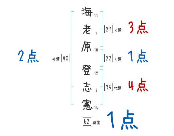 天運![]() | 海老原登志憲さんの天運は27画の3つ星!頭脳明晰だが強情で摩擦が多い傾向。孤立に注意。 家系が持つ宿命的な運勢を表します。祖先から受け継いだ苗字ですので自分の力が及びません。家柄を象徴します。 |