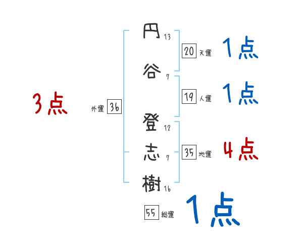 外運![]() | 円谷登志樹さんの外運は36画の3つ星!先見性が豊かです。多少神経質で苦労することも。 生活面を象徴する運勢です。外部から受ける影響力を表し、結婚運、家庭運や職場、環境への順応性を表します。 |