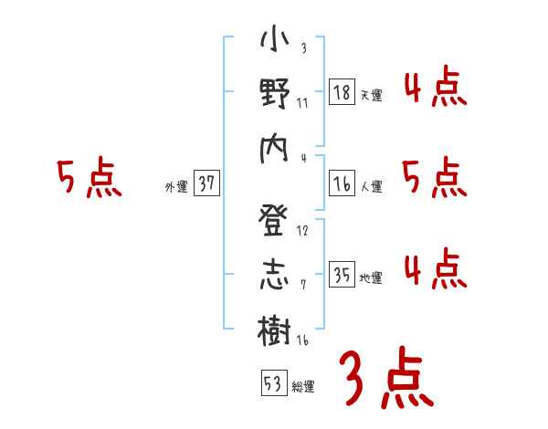 外運![]() | 小野内登志樹さんの外運は37画の5つ星!努力家で順応性に優れる。現実的な考え方ができ忠実に物事をこなす。 生活面を象徴する運勢です。外部から受ける影響力を表し、結婚運、家庭運や職場、環境への順応性を表します。 |