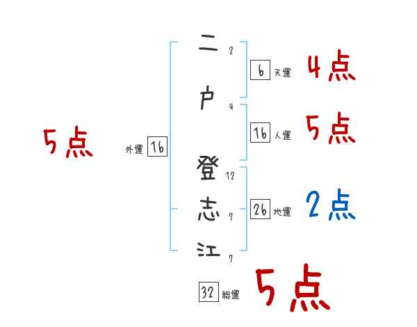 人運![]() | 二戸登志江さんの人運は16画の5つ星!人望が厚く大きく発展する。逆転成功が見える。 性格や才能などを表す2番目に重要な運勢です。人間関係や協調性、社会的な成功に影響します。主に20歳から50歳ぐらいまでの中年期の運勢を表します。 |