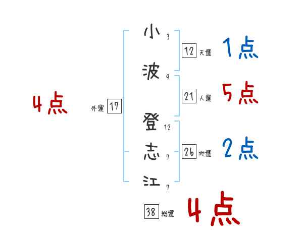 天運![]() | 小波登志江さんの天運は12画の1つ星!簡単な失敗で諦めてしまいやすいかも。着実に行動すると良いでしょう。 家系が持つ宿命的な運勢を表します。祖先から受け継いだ苗字ですので自分の力が及びません。家柄を象徴します。 |
