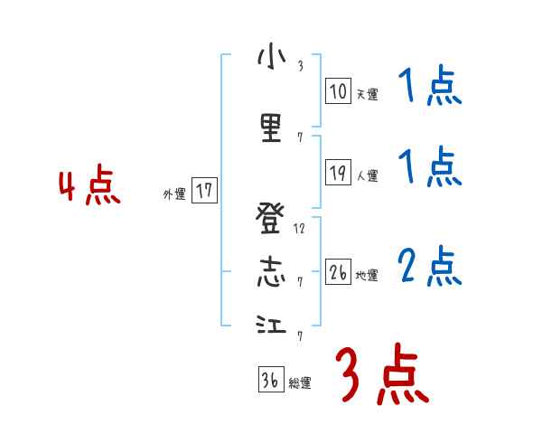 外運![]() | 小里登志江さんの外運は17画の4つ星!積極的な行動力。地位を気づき財産を手に入れる。純粋な心と直感力。 生活面を象徴する運勢です。外部から受ける影響力を表し、結婚運、家庭運や職場、環境への順応性を表します。 |