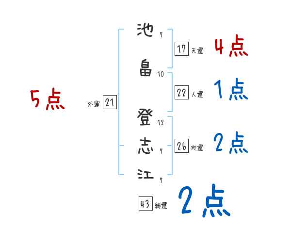 外運![]() | 池畠登志江さんの外運は21画の5つ星!統率力がある。独立し成功する。名誉を手に入れる。 生活面を象徴する運勢です。外部から受ける影響力を表し、結婚運、家庭運や職場、環境への順応性を表します。 |