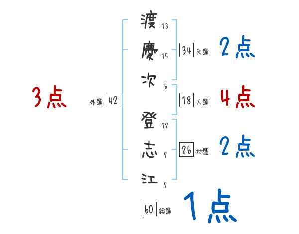 天運![]() | 渡慶次登志江さんの天運は34画の2つ星!独創性に優れるが、自尊心が強く災難に注意しましょう。 家系が持つ宿命的な運勢を表します。祖先から受け継いだ苗字ですので自分の力が及びません。家柄を象徴します。 |