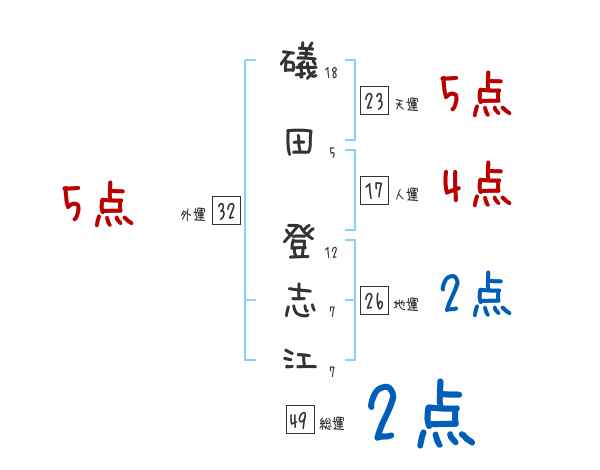 外運![]() | 礒田登志江さんの外運は32画の5つ星!柔軟性があり成功する。チャンスが多く金運が良い。 生活面を象徴する運勢です。外部から受ける影響力を表し、結婚運、家庭運や職場、環境への順応性を表します。 |