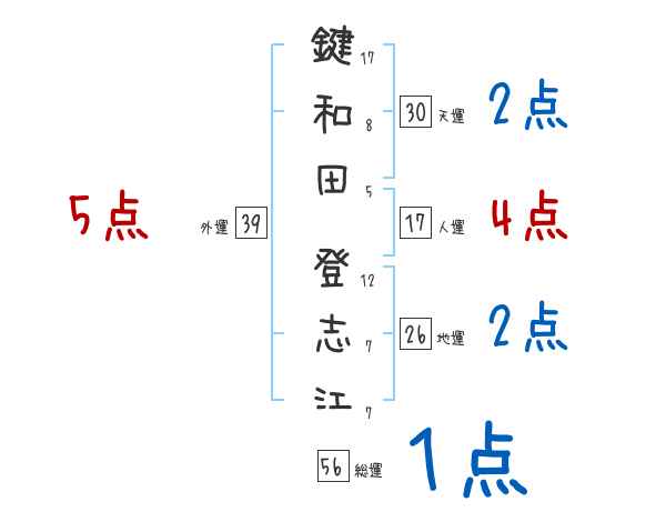 外運![]() | 鍵和田登志江さんの外運は39画の5つ星!社交性に優れ人望が厚い。人の上に立ち成功する。 生活面を象徴する運勢です。外部から受ける影響力を表し、結婚運、家庭運や職場、環境への順応性を表します。 |
