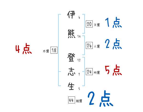 総運![]() | 伊熊登志生さんの総運は44画の2つ星!誠実で慎重な性格。物事を考えすぎないように注意しましょう。 あなたの人生を表す1番重要な運勢です。生涯を通じて影響する総合運となり、主に50歳以降の晩年期に影響を及ぼします。 |