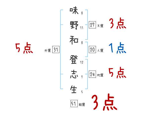 総運![]() | 味野和登志生さんの総運は51画の3つ星!変化が激しく、危険に注意。堅実な性格。 あなたの人生を表す1番重要な運勢です。生涯を通じて影響する総合運となり、主に50歳以降の晩年期に影響を及ぼします。 |