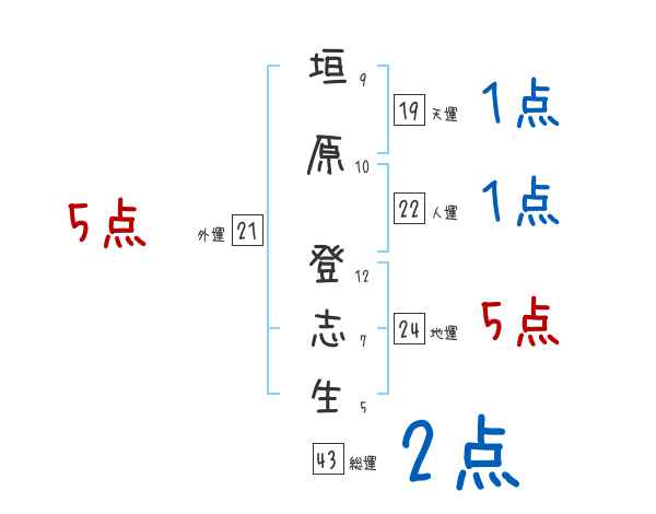 総運![]() | 垣原登志生さんの総運は43画の2つ星!頑固な性格で独立心が強いかも。やや非現実的で浪費に注意しましょう。 あなたの人生を表す1番重要な運勢です。生涯を通じて影響する総合運となり、主に50歳以降の晩年期に影響を及ぼします。 |