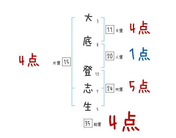 総運![]() | 大底登志生さんの総運は35画の4つ星!温厚な性格で感受性が高い。穏和な性格で人望が厚い。 あなたの人生を表す1番重要な運勢です。生涯を通じて影響する総合運となり、主に50歳以降の晩年期に影響を及ぼします。 |