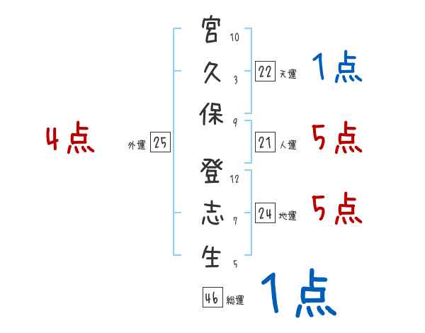 外運![]() | 宮久保登志生さんの外運は25画の4つ星!個性があり才能があふれる。強運の持ち主で発展する。 生活面を象徴する運勢です。外部から受ける影響力を表し、結婚運、家庭運や職場、環境への順応性を表します。 |