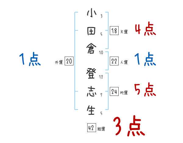 人運![]() | 小田倉登志生さんの人運は22画の1つ星!努力することが苦手ないっぽう手先が器用。芸術性にも優れる。 性格や才能などを表す2番目に重要な運勢です。人間関係や協調性、社会的な成功に影響します。主に20歳から50歳ぐらいまでの中年期の運勢を表します。 |