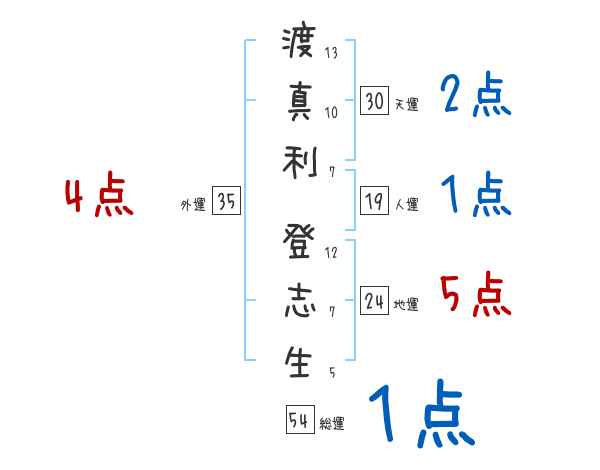 外運![]() | 渡真利登志生さんの外運は35画の4つ星!温厚な性格で感受性が高い。穏和な性格で人望が厚い。 生活面を象徴する運勢です。外部から受ける影響力を表し、結婚運、家庭運や職場、環境への順応性を表します。 |