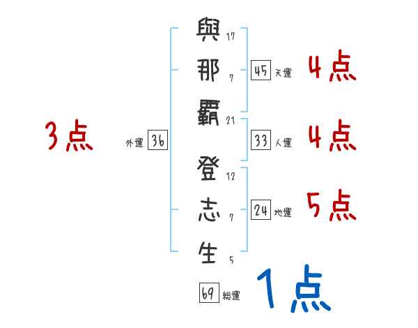 天運![]() | 與那覇登志生さんの天運は45画の4つ星!もくもくと物事を進め達成する。地味な努力家。 家系が持つ宿命的な運勢を表します。祖先から受け継いだ苗字ですので自分の力が及びません。家柄を象徴します。 |