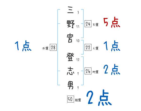 天運![]() | 三野宮登志男さんの天運は24画の5つ星!家庭運が良く順調な人生。金運にも恵まれる。 家系が持つ宿命的な運勢を表します。祖先から受け継いだ苗字ですので自分の力が及びません。家柄を象徴します。 |