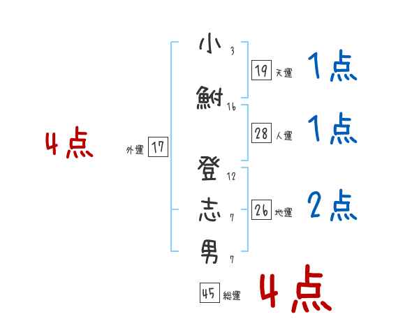 外運![]() | 小鮒登志男さんの外運は17画の4つ星!積極的な行動力。地位を気づき財産を手に入れる。純粋な心と直感力。 生活面を象徴する運勢です。外部から受ける影響力を表し、結婚運、家庭運や職場、環境への順応性を表します。 |