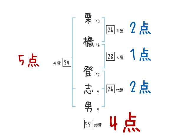 地運![]() | 栗橋登志男さんの地運は26画の2つ星!波瀾万丈かも。信頼できる人を大事にしましょう。 個性を表す基礎的な運勢です。性格形成や対人関係、行動力など家庭環境に影響されます。主に誕生してから20歳くらいまでの若年期の運勢を表します。 |