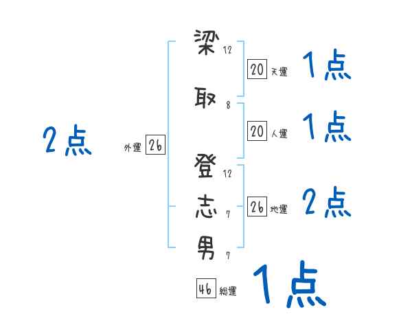 天運![]() | 梁取登志男さんの天運は20画の1つ星!社交が苦手。人とは違った才能があり波乱万丈な人生かも。 家系が持つ宿命的な運勢を表します。祖先から受け継いだ苗字ですので自分の力が及びません。家柄を象徴します。 |