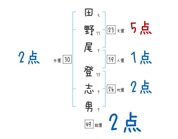 人運![]() | 田野尾登志男さんの人運は19画の1つ星!優れた才能を持ちますが、協調性が足りないことも。周りの人と協力する事を意識しましょう。 性格や才能などを表す2番目に重要な運勢です。人間関係や協調性、社会的な成功に影響します。主に20歳から50歳ぐらいまでの中年期の運勢を表します。 |