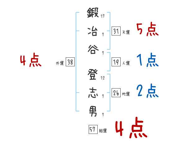 天運![]() | 鍛冶谷登志男さんの天運は31画の5つ星!社交性があり判断力に優れる。順風満帆な人生で円満な生活。 家系が持つ宿命的な運勢を表します。祖先から受け継いだ苗字ですので自分の力が及びません。家柄を象徴します。 |