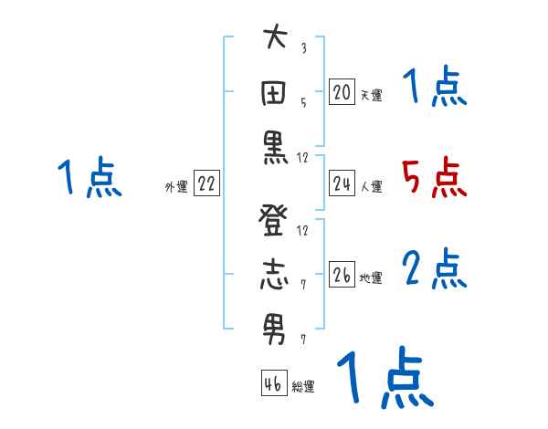 総運![]() | 大田黒登志男さんの総運は46画の1つ星!迷走することが多く苦労するかも。目先のことにとらわれないように。 あなたの人生を表す1番重要な運勢です。生涯を通じて影響する総合運となり、主に50歳以降の晩年期に影響を及ぼします。 |