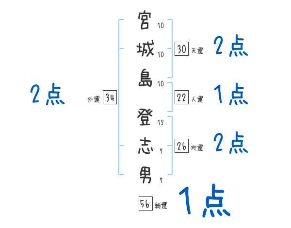 外運![]() | 宮城島登志男さんの外運は34画の2つ星!独創性に優れるが、自尊心が強く災難に注意しましょう。 生活面を象徴する運勢です。外部から受ける影響力を表し、結婚運、家庭運や職場、環境への順応性を表します。 |