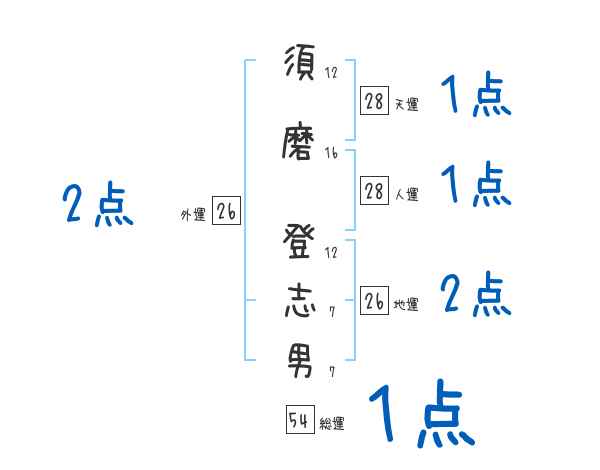 天運![]() | 須磨登志男さんの天運は28画の1つ星!家庭環境に注意。スポーツで活躍できる能力があるかも。 家系が持つ宿命的な運勢を表します。祖先から受け継いだ苗字ですので自分の力が及びません。家柄を象徴します。 |